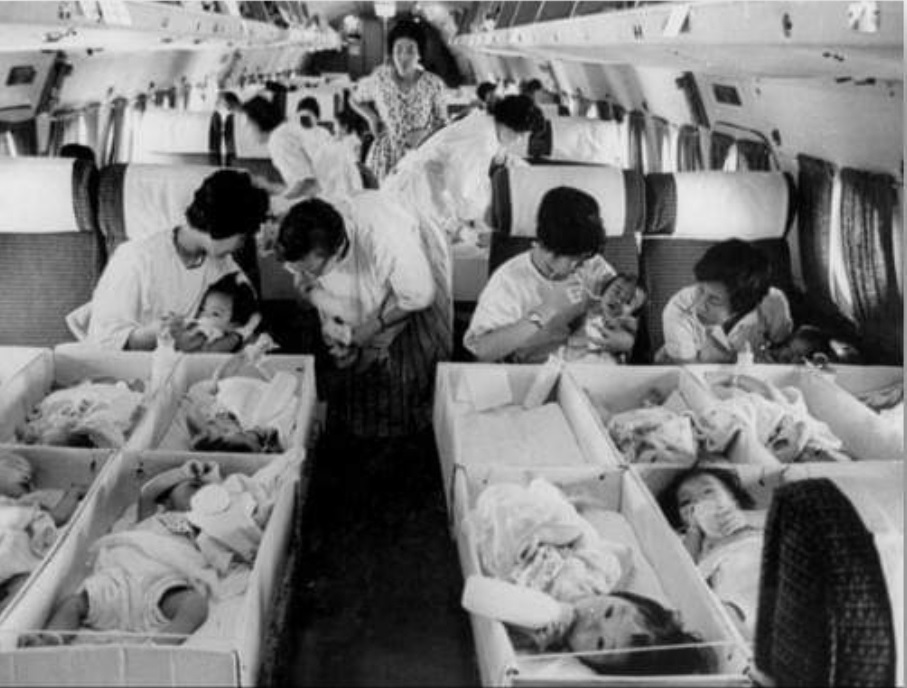 A flight evacuating Holt children from Da Nang arrives in Saigon in late March 1975. From the Holt website. During the Vietnam war, President Gerald Ford authorized the evacuation of Vietnamese children to the U.S. The airlifts were framed as an act of rescue, although the crash of one of the evacuation planes killing 138 people (including 78 children) and the discovery that some of the childrens’ parents did not consent to their child’s evacuation caused criticism of the operation.